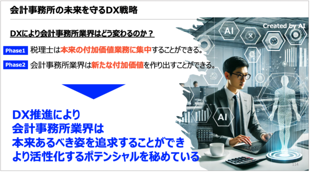 DXを味方に付けることで、会計事務所の働き方がどのように変わっていくのかについて、お話させていただきました。